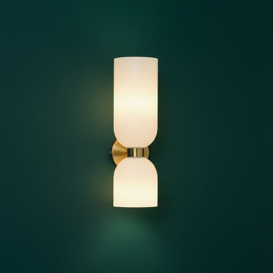 Art Deco Wall Light | Brass Cylinder LED Sconce with Double Frosted Shades
