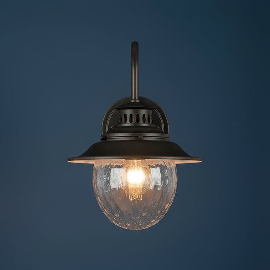 Antique Brass Outdoor Wall Light | Industrial Lantern-Style Sconce with Curved Arm and Hammered Glass Shade