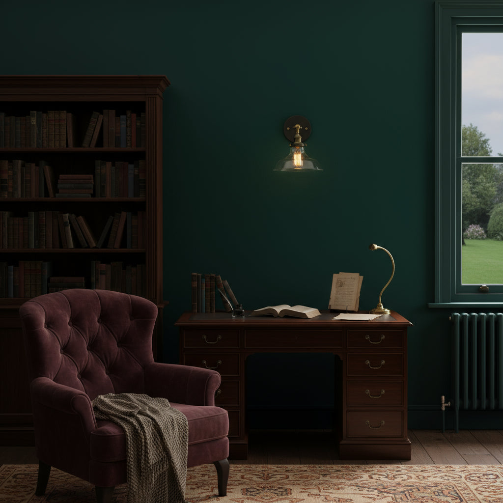 A brass and glass wall sconce illuminating a classic reading desk, creating a refined atmosphere perfect for study or relaxation.