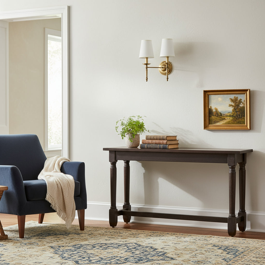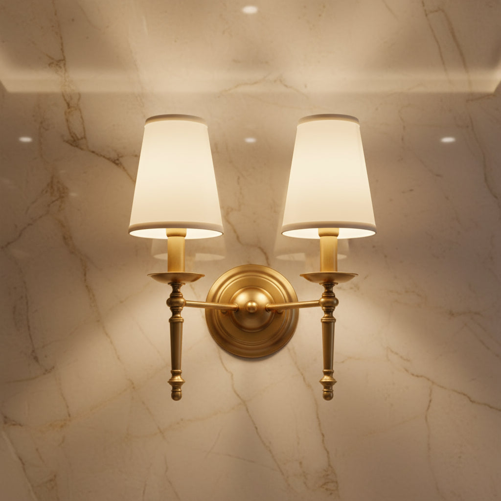 A twin brass wall sconce with white fabric shades adds refined symmetry and soft illumination to elegant entryways or living rooms.