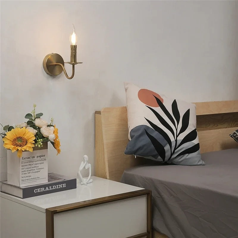 A sleek brass wall sconce with a candle-style bulb, combining modern simplicity and vintage charm for a warm accent glow.