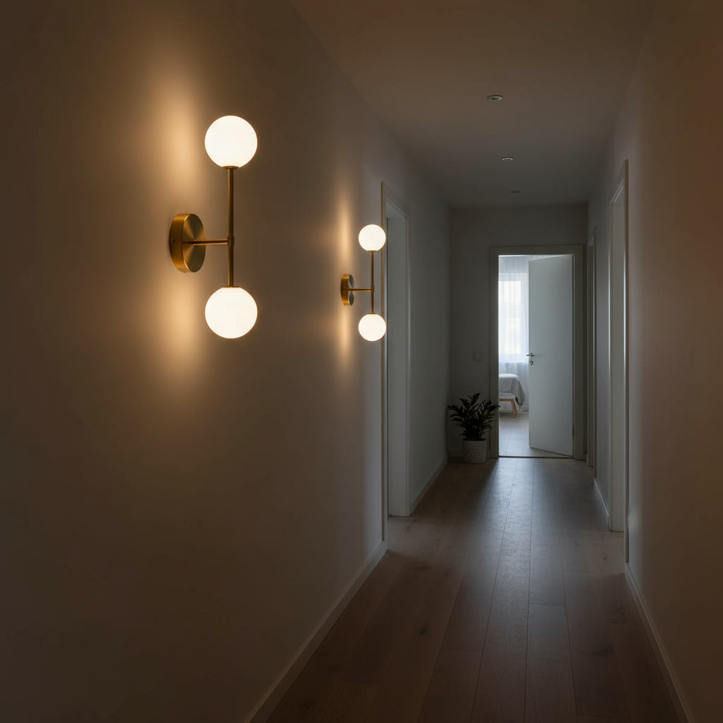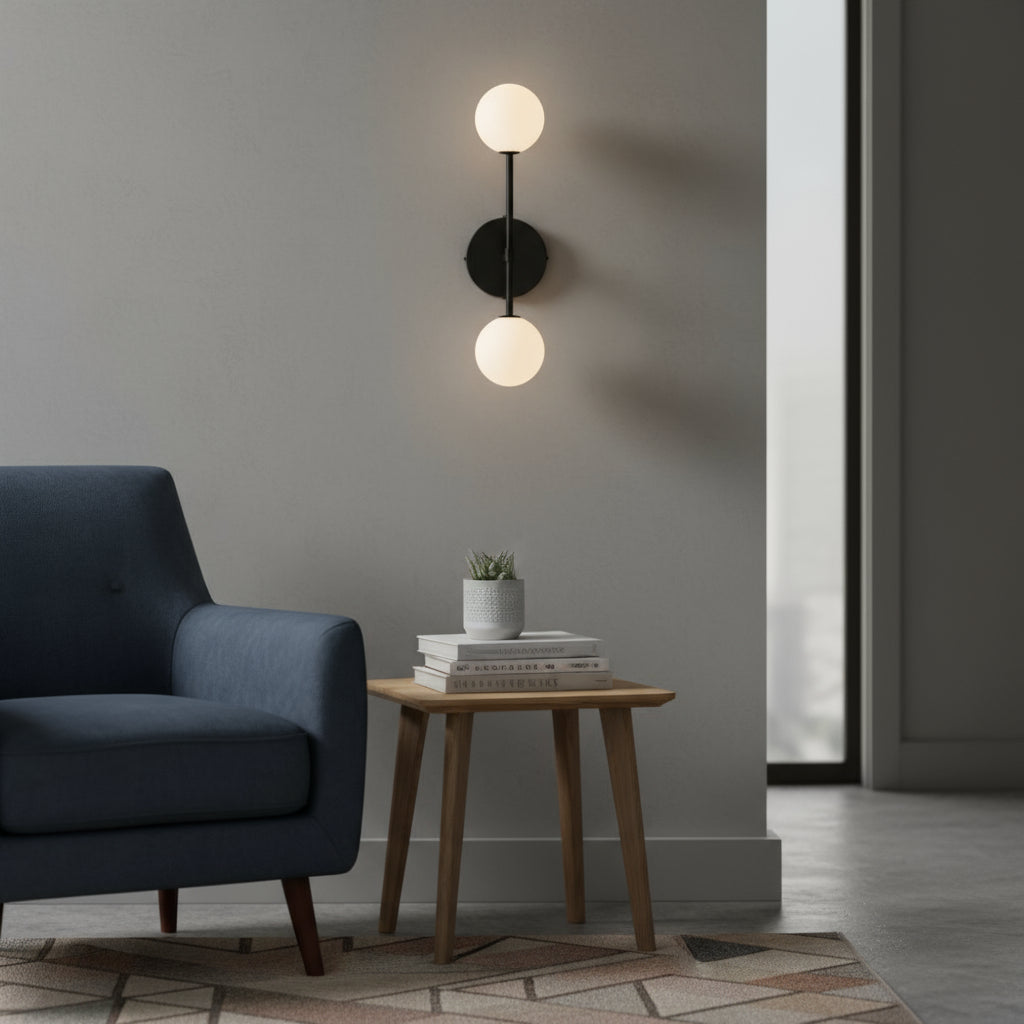 The double globe wall light creates perfect symmetry and balance in your space. Its sleek design adds sophistication while providing soft, even illumination that enhances the atmosphere of your bedroom or living area.