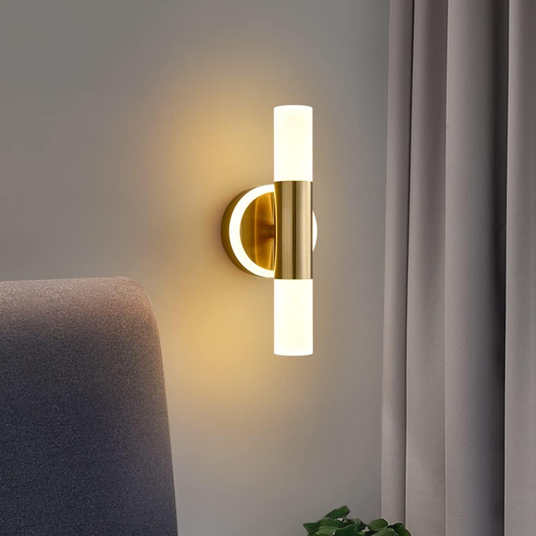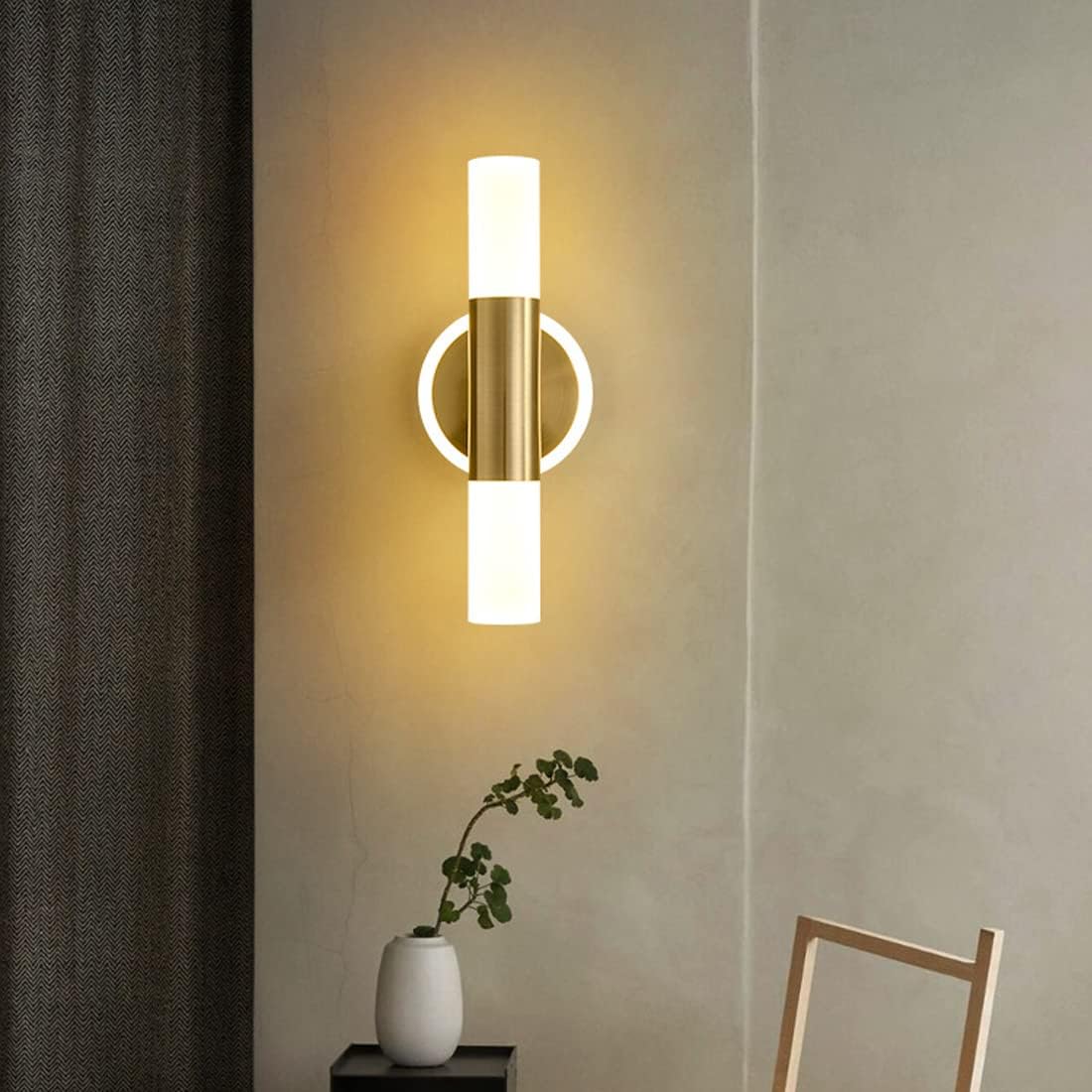 A sleek brass frame with dual frosted tubes diffuses soft, ambient light, perfect for bedside or hallway elegance.