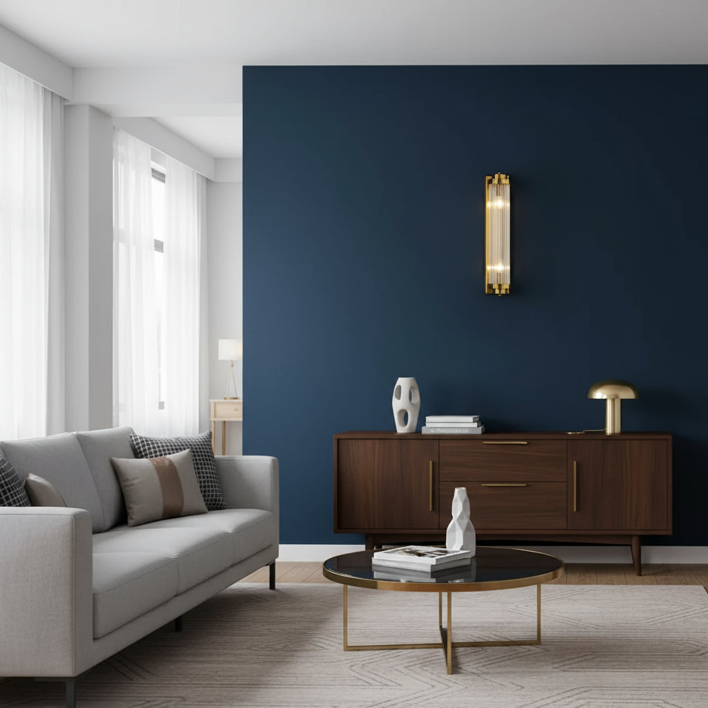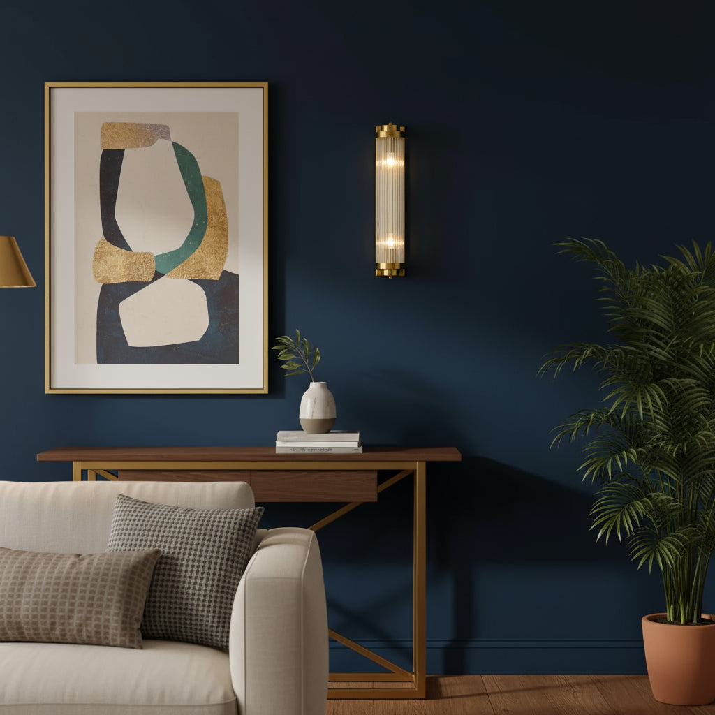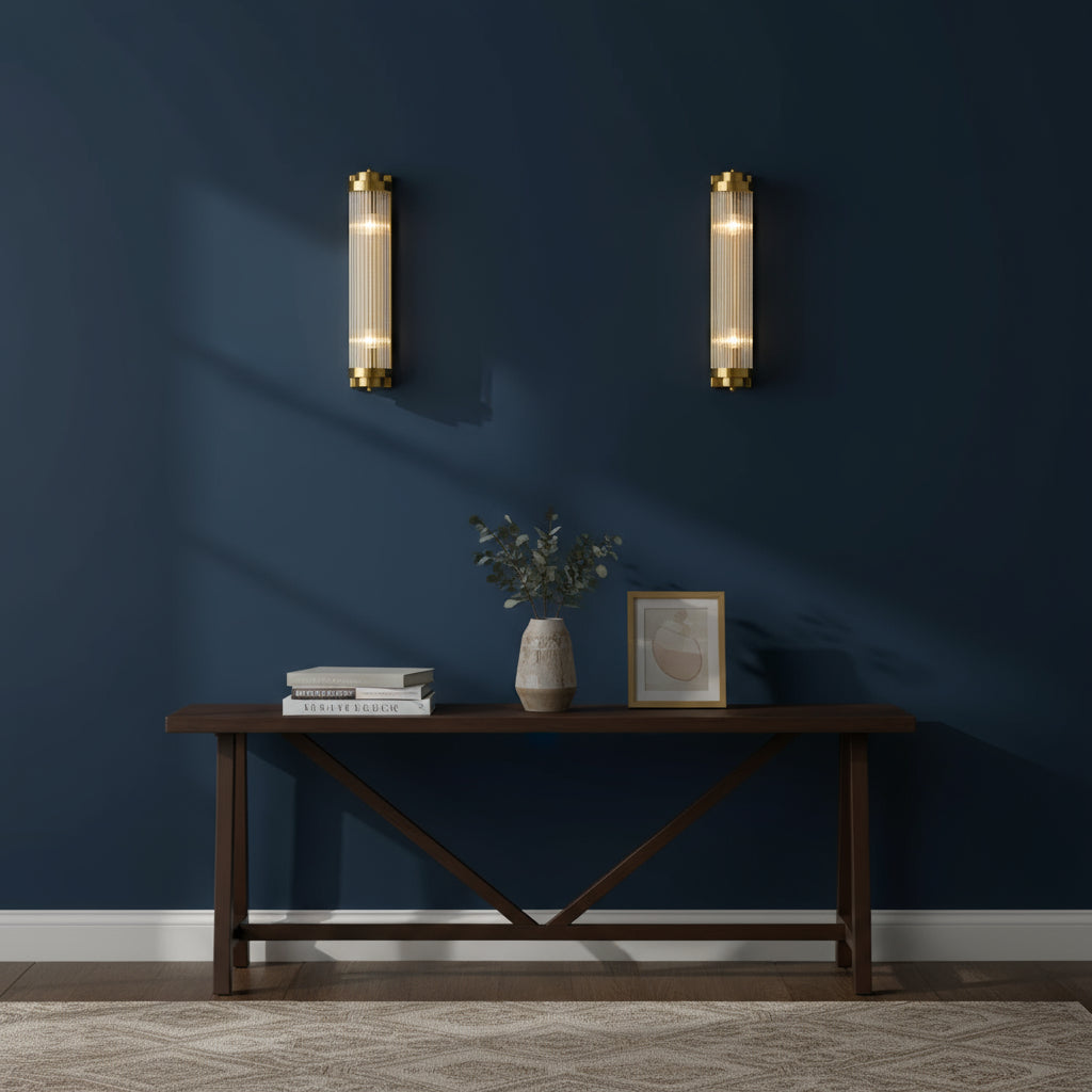 This wall light features a stunning ribbed glass cylinder paired with a golden frame, creating a refined balance of elegance and warmth. The vertical design enhances the height of your space, while the soft glow adds a sophisticated ambiance ideal for hallways, living rooms, or bedrooms.