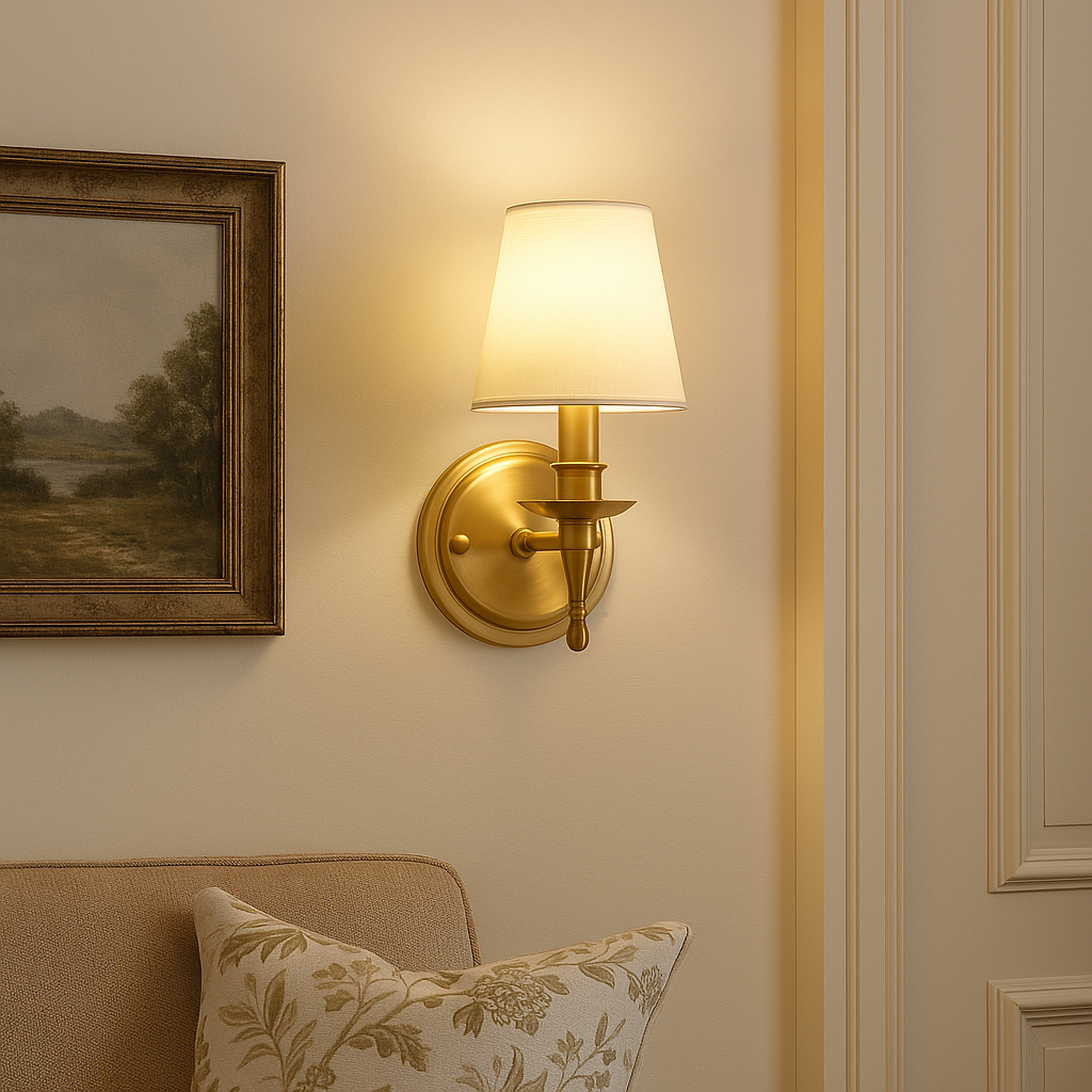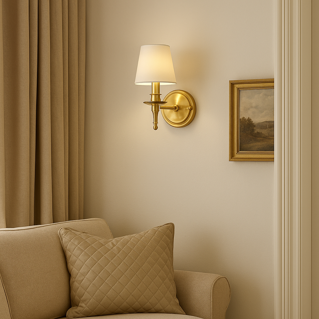 Bring timeless charm to your interior with this golden wall light. Its brushed brass finish and fabric shade create a warm and welcoming glow, perfect for living rooms, hallways, or bedrooms. A versatile piece that elevates any décor with subtle luxury.