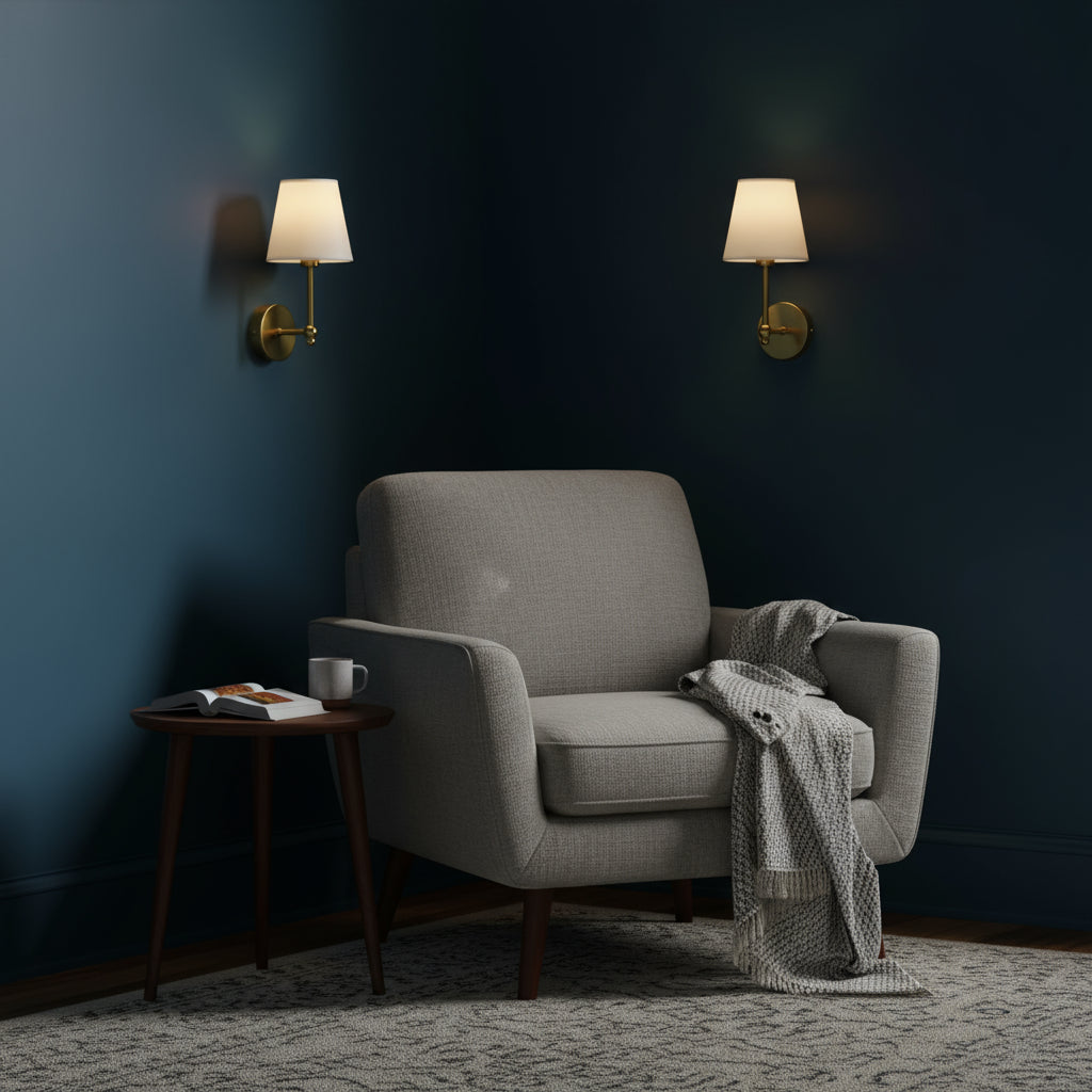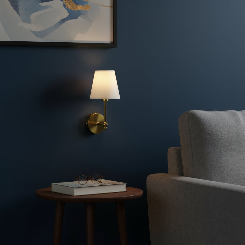 This wall lamp features a classic brass structure with a white lampshade, adding timeless elegance to your space. Perfect for creating a cozy and refined atmosphere in any room.