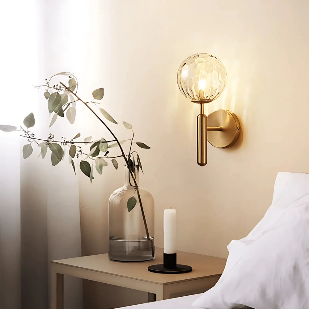 Brass wall sconces with glass globes create a striking focal point, casting soft light that enhances any room’s atmosphere.