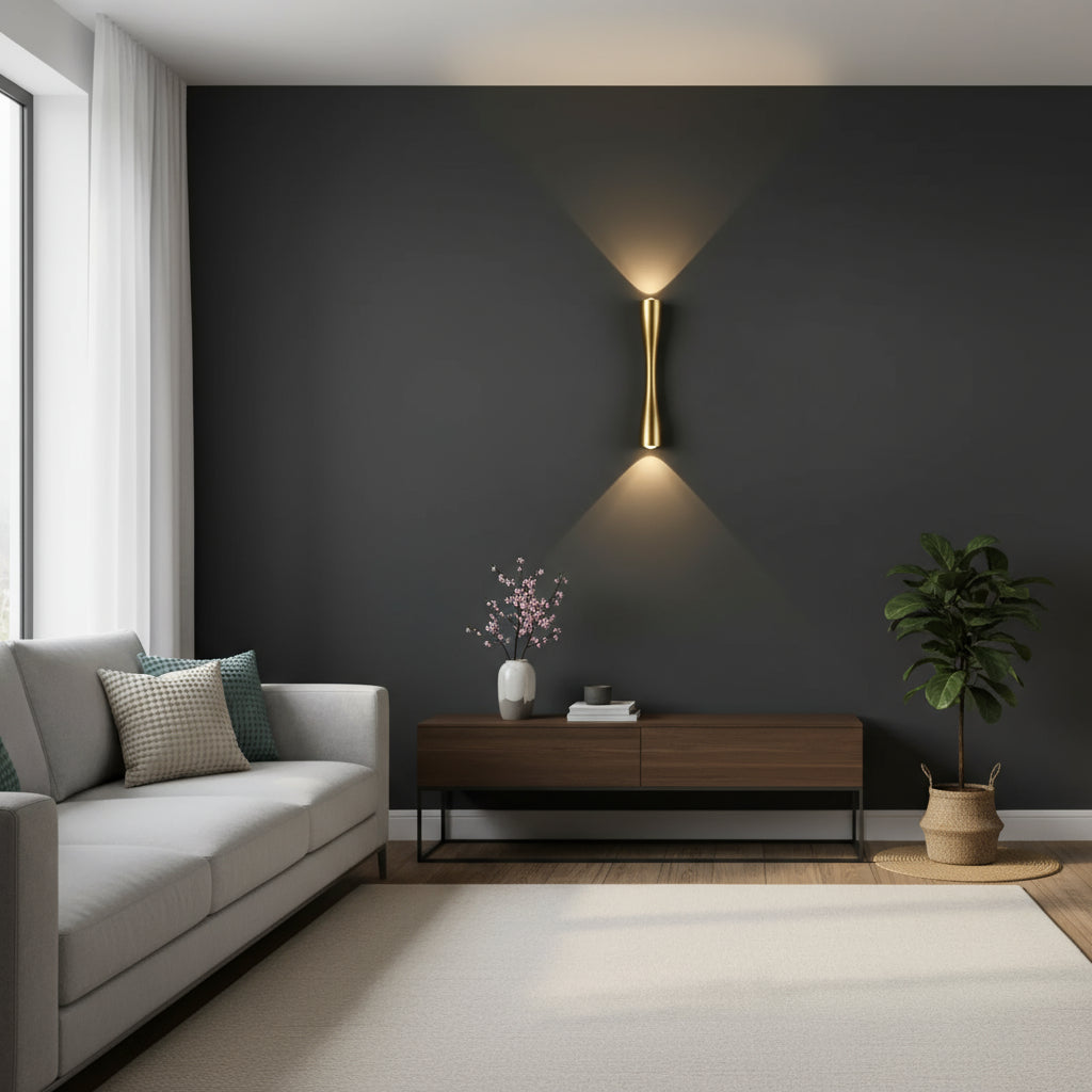 The elongated brass design casts light both up and down, adding sophistication and depth to walls while creating a warm, inviting ambiance.