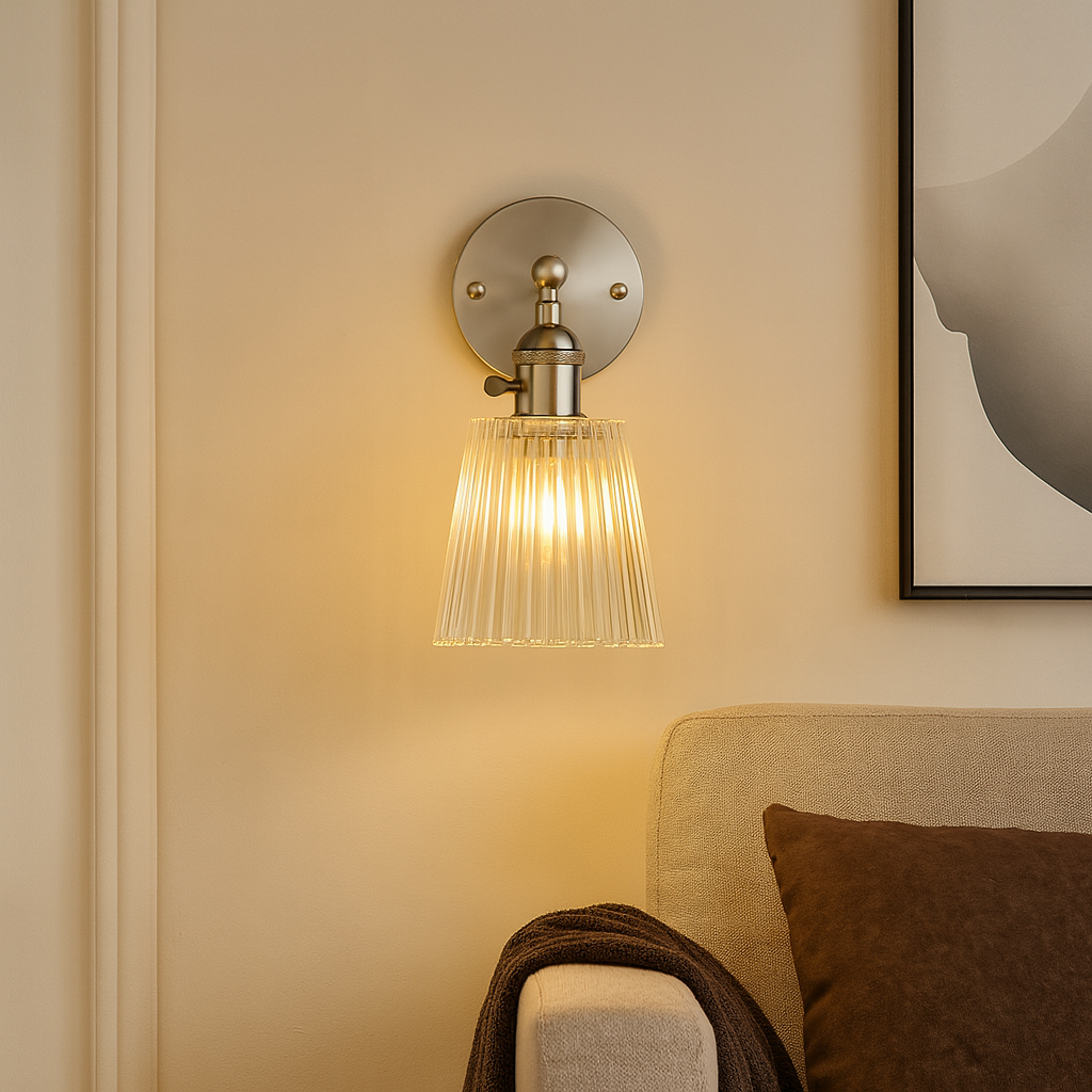 Featuring a brushed brass frame and a fluted glass shade, this wall light delivers a warm, refined glow perfect for cozy interiors.