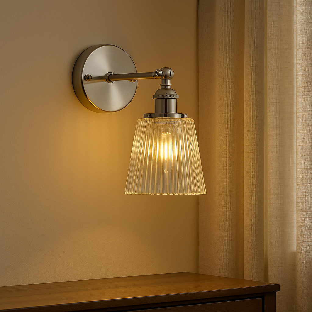 A sleek combination of metallic finish and ribbed glass, offering ambient illumination with timeless sophistication.