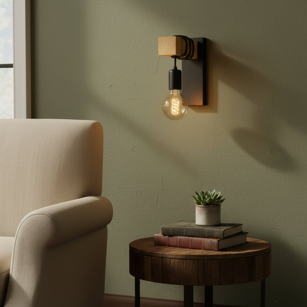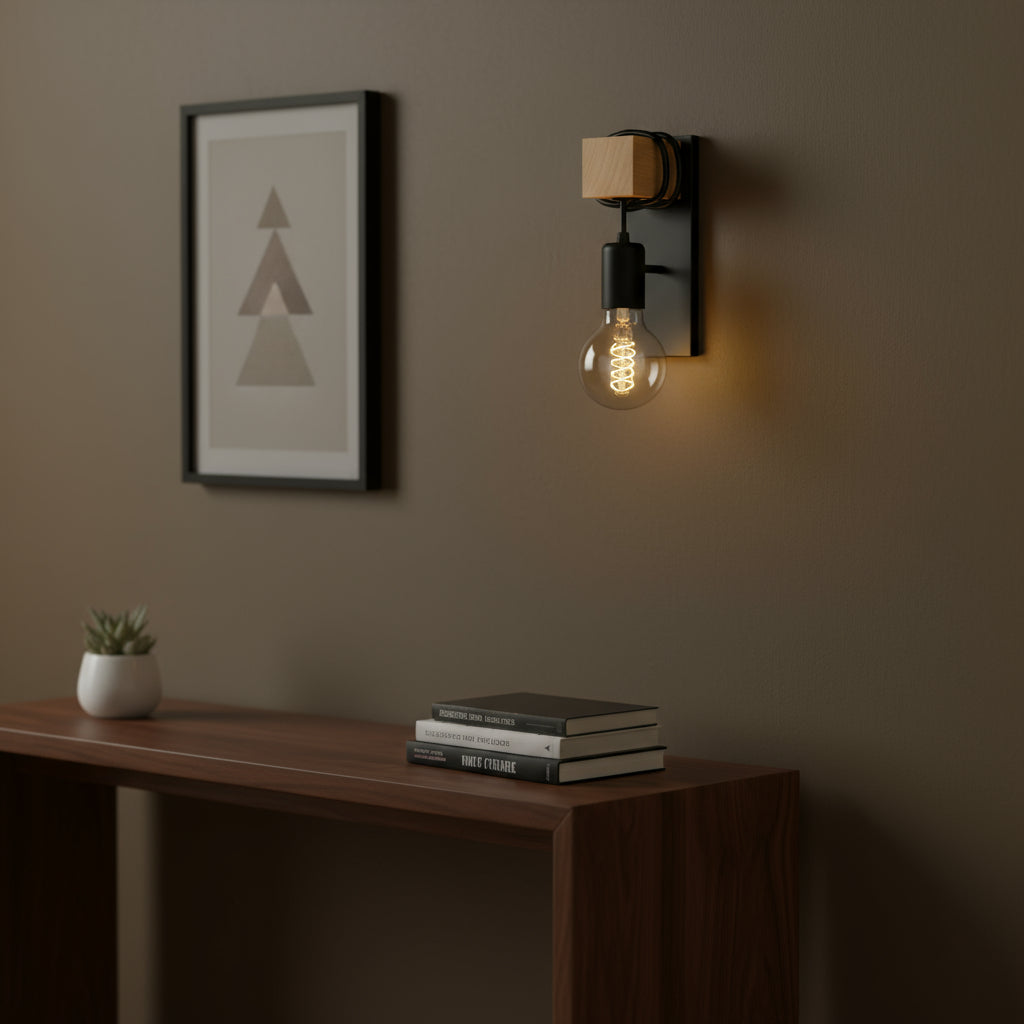 A sleek wall sconce combining natural wood with matte black metal, creating a modern yet warm ambiance.