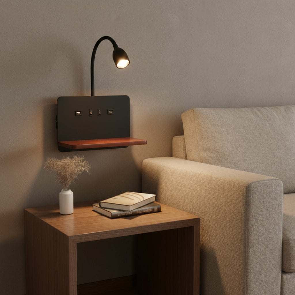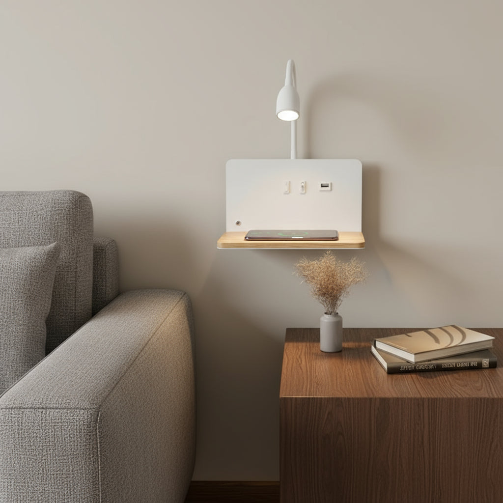 Placed next to the bed, this lamp provides both a cozy reading light and charging options. Its sleek design with a wooden shelf makes it a stylish and functional addition to your bedroom.