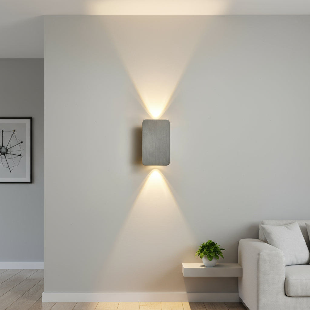 Rectangular wall sconces in multiple finishes, projecting light both upward and downward for a sophisticated ambiance.