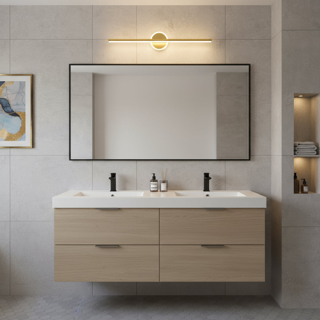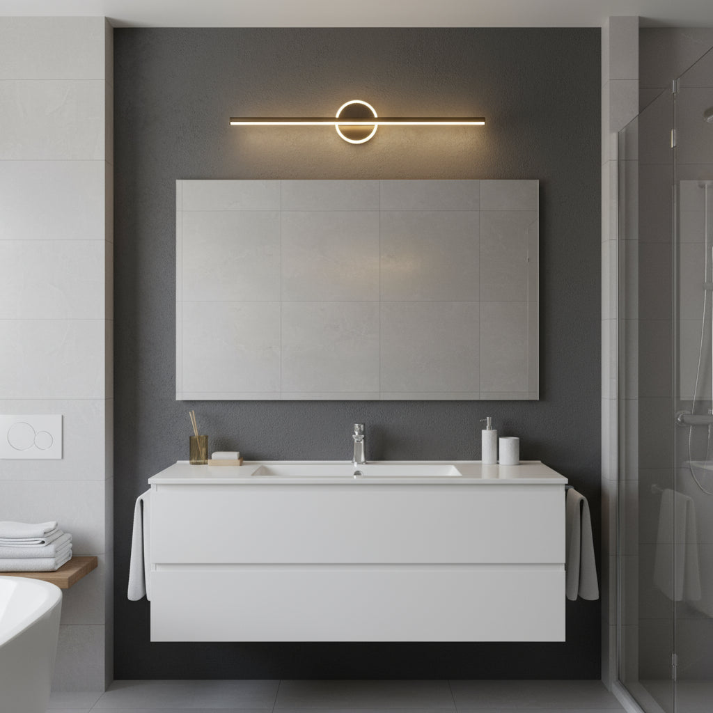 A sleek linear LED vanity light with a circular accent, offering a soft, even glow ideal for contemporary bathrooms.