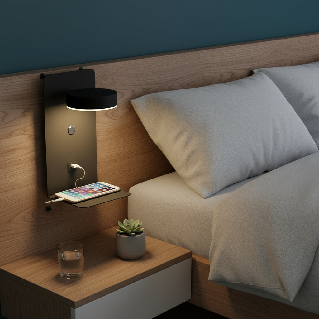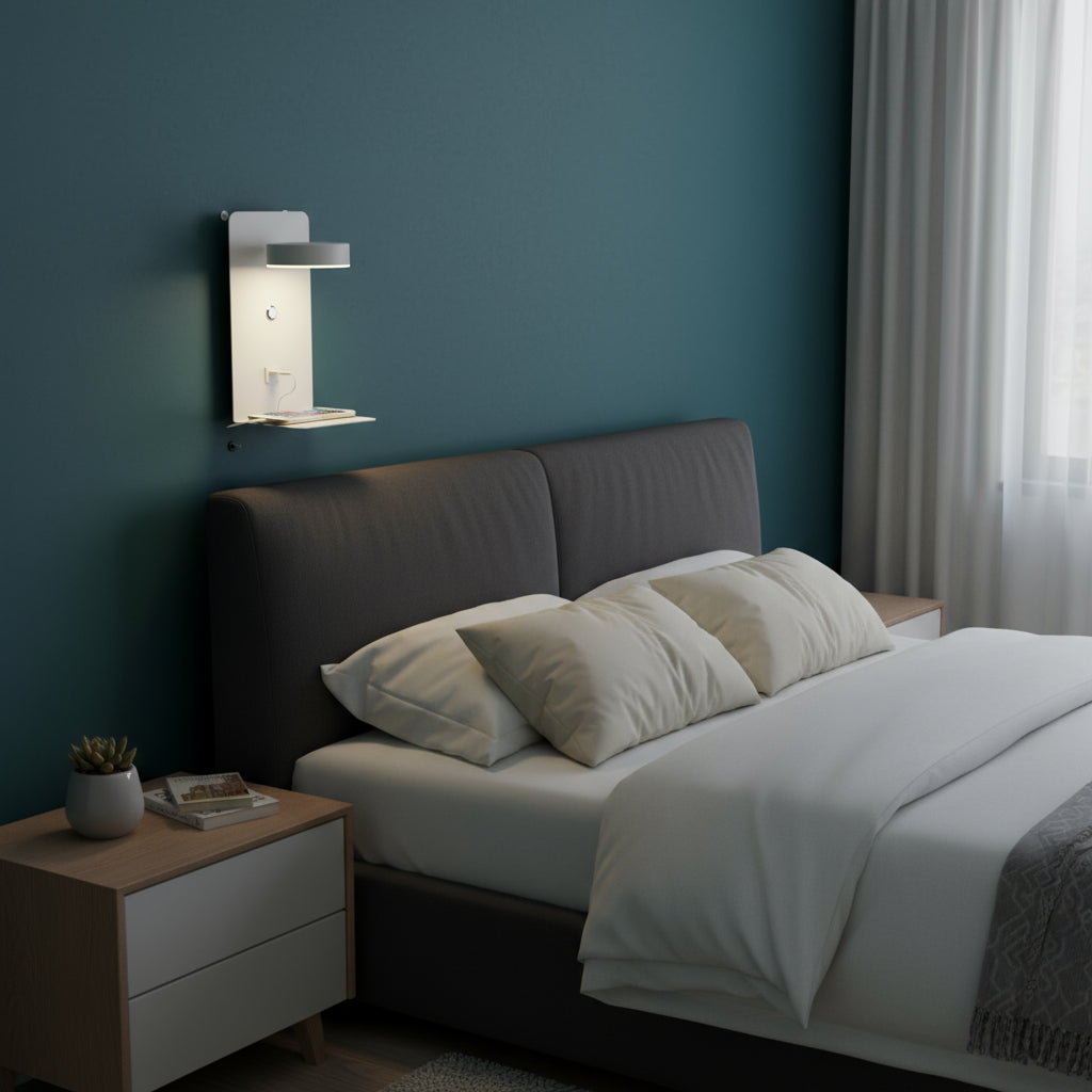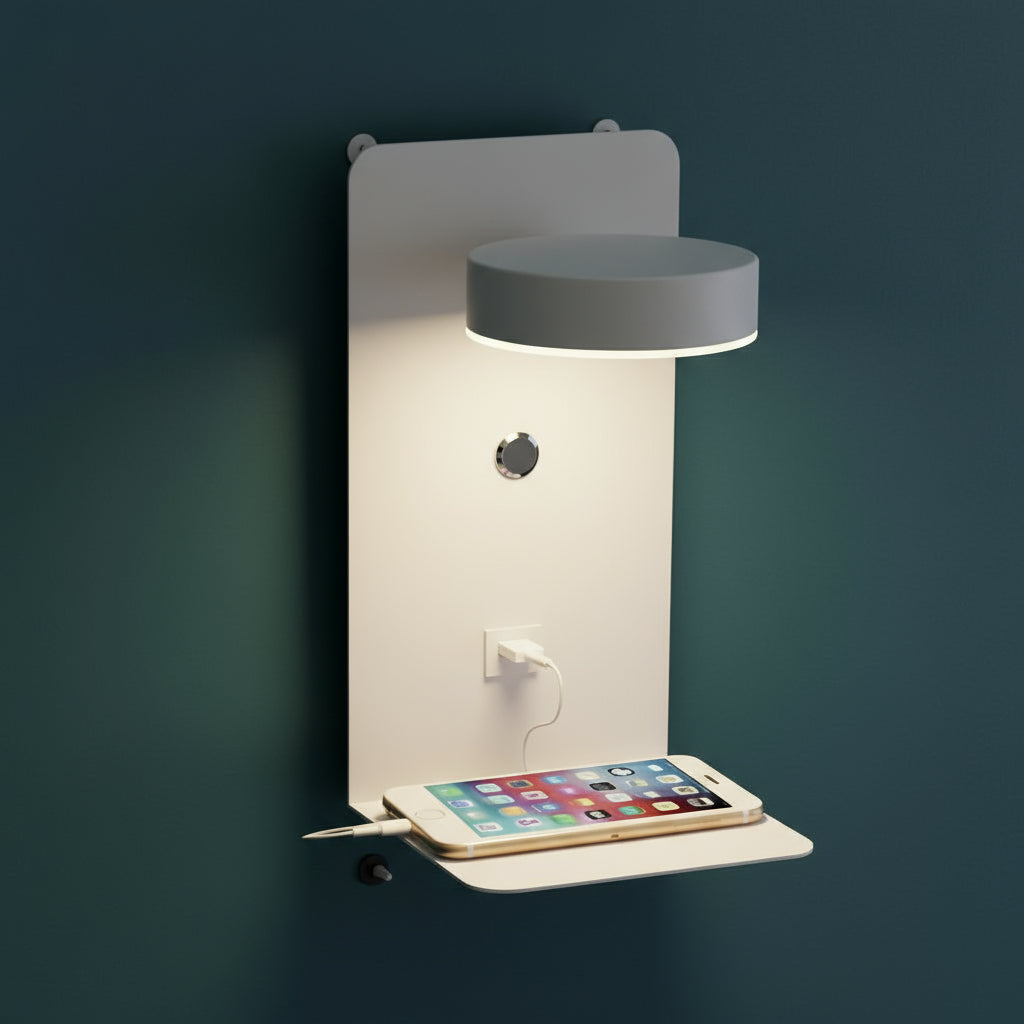 Perfectly designed for bedside use, this wall lamp provides focused lighting for reading while offering a convenient shelf for your phone. Its minimalist look and dual functionality make it an essential accessory for any modern bedroom.