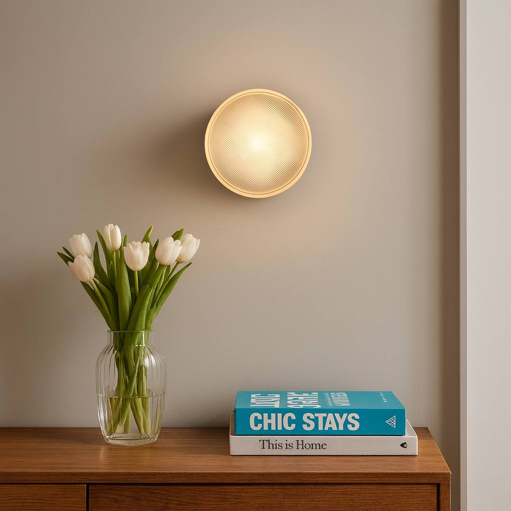 The textured glass lens paired with a brass or black base diffuses a refined light, bringing elegance and character to hallways, bedrooms, or living rooms.