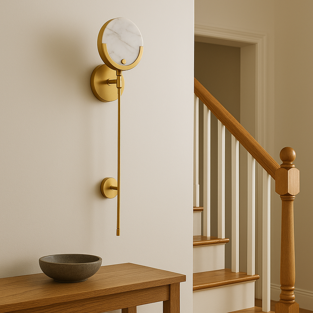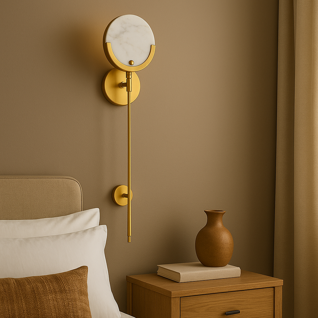 This golden wall light with a marble shade brings a refined glow that instantly enhances your bedroom ambiance. Its sleek design combines timeless elegance with modern sophistication, making it the perfect choice to create a cozy yet upscale atmosphere.