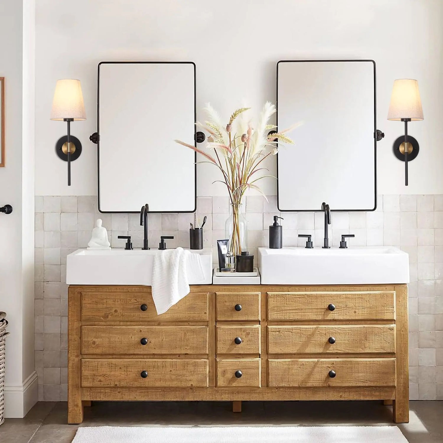 Slim black frame with a warm fabric shade creates a timeless wall lamp, ideal for bathrooms, hallways, or vanity mirrors.