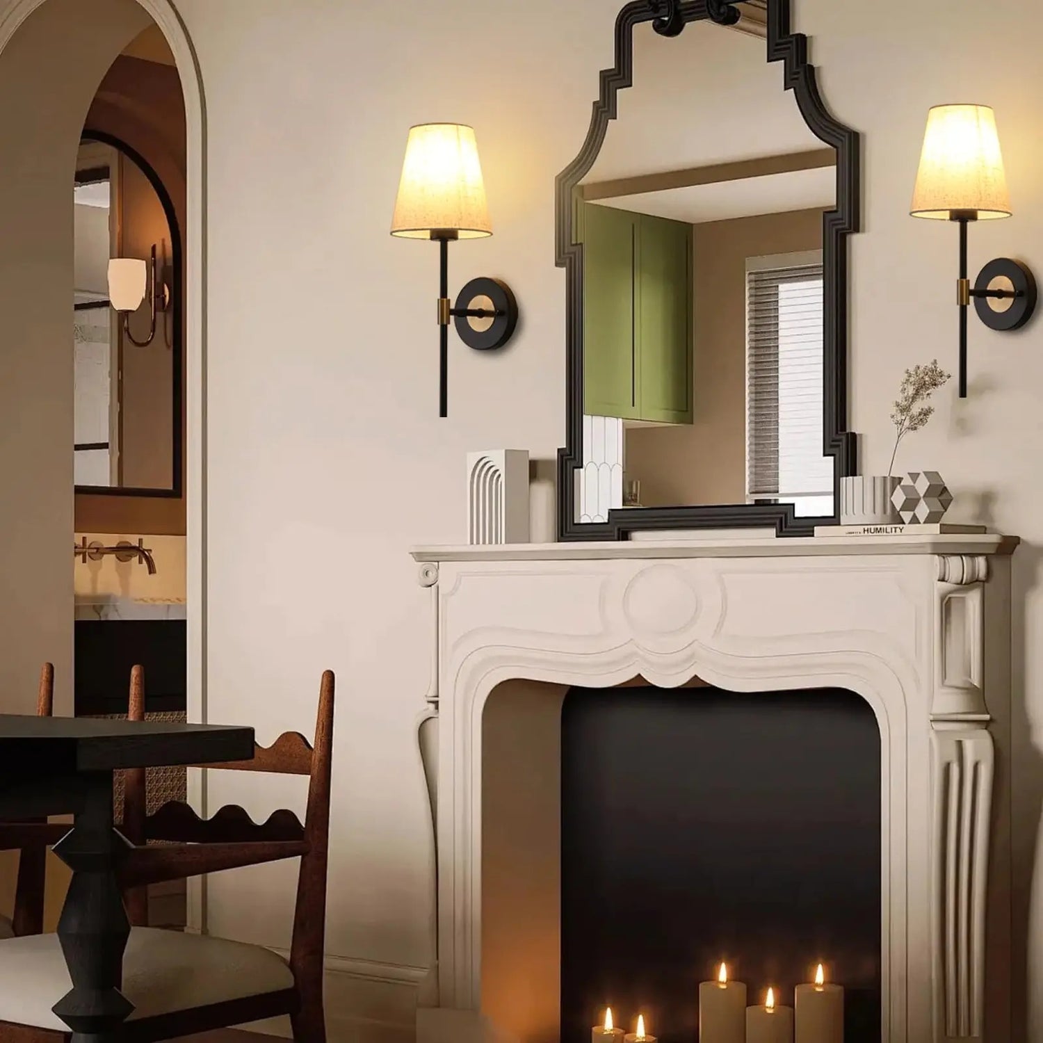 Perfect above a fireplace or in living areas, this wall sconce blends soft fabric lighting with a chic black-and-gold finish.