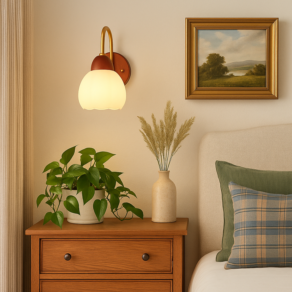 A rounded opal glass shade paired with brass and walnut tones, bringing vintage charm and soft glow to intimate interiors.